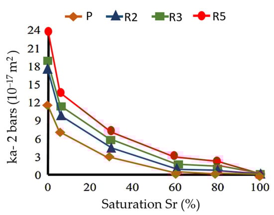 Sogbossi et al. [] conducted an experiment using the Cembureau permeameter to study the transfer properties within plain concrete samples and concrete reinforced with ribbed steel with a diameter of 14 mm. The steel is expected to reduce the voids at the interface due to the presence of ribs that bind firmly with concrete []. The Cembureau permeameter is a standardized apparatus that assesses the flow measurement of gas within a porous material. The inlet pressure was regulated from 2 to 5 bar and set pressure level was sustained close to 1% with respect to the pressure selected throughout the measurement of the air flow (Figure 17). The percolation length, which corresponds to the anchorage length, was taken as only 50 mm, so that little time was needed to attain a steady state condition [].