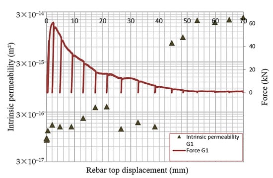 Permeability systems were developed to evaluate the permeability of a porous material through the flow of fluid or gas at pressure gradient. Three types of testing were conducted on steel reinforced specimens, push-in testing [], tie beam testing [,], and Cembureau constant head permeameter []. The push-in testing is implemented in order to examine the gas transfer, affected by the shear stresses at the steel-concrete interface (Figure 16). The properties of the specimen are the same as previously discussed in Section 4.1. Using Darcy’s law, the apparent permeability (m2) in the longitudinal direction is calculated using Equation (1).