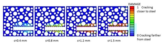 The increased presence of voids at the SCI due to poor compaction of fresh concrete is also related to the increase in the concrete thickness layer under the steel. The “top bar effect,” known as a defect at the interfacial zone, demonstrates that voids are found under and along the reinforcement in the top part of structures [,]. As a result, the increase in porosity and macroscopic openings under bars placed horizontally is related to the top bar effect [,].