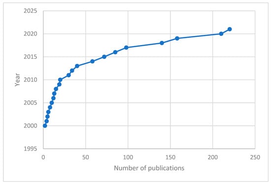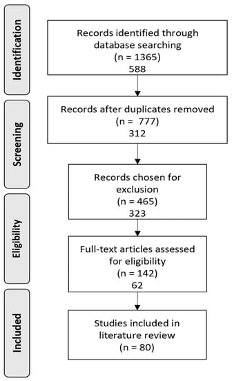 The initial literature search generated 1365 articles. Following screening, to remove irrelevant articles, duplicates, and literature outside the scope of this research, the relevance and area of the research were considered (Figure 1). The final articles (n = 80) chosen for inclusion in this study are shown in full classification (Table 1). The number of publications relating to responsible sourcing and green supply chain management has increased over the last decade with 68% of articles within this study being post–2010 (n = 54) and all articles chosen for this study were published post–2000 (Figure 2). The articles were primarily journal articles (n = 63) with the remaining articles noted as conference papers and book chapters (n = 17). The top ten cited articles included in the study are shown in Table 2. The top publications totals 31,262 previous citations.