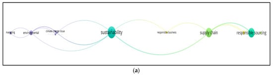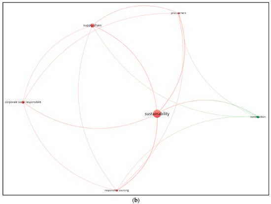 It has been noted previously that keywords can be used to provide a concise description of the content. Thus, a network of keywords can be used to depict knowledge, and relationships between keywords can evidence the overlapping knowledge base provided by researchers (Sue and Lee, 2010). Using VOSviewer, “Author Keywords” and “Fractional Counting” filtered to 8 and 3 respectively recurring throughout the literature chosen for this study []. The node size and connecting lines between the keywords are recurring throughout the articles on responsible sourcing. Each cluster is presented in different colours, and keywords within the same cluster are linked with each other strongly. These figures (Figure 4a,b) highlight those keywords such as sustainability, are strongly linked with supply chain, construction, and responsible sourcing—reinforcing that the literature chosen for this study is appropriate to address the aim.