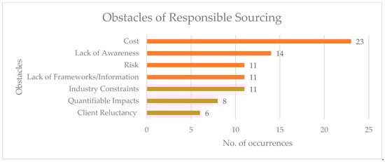 Whilst sustainable development allows prioritising lifestyles in harmony with nature there remains disillusion surrounding responsible behaviours []. As previously identified, the most commonly reported obstacles were cost, industry constraints, and a lack of frameworks and awareness. Throughout this section, these aspects will be explored in more detail.