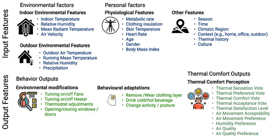According to the ISO 7730 and ASHRAE standards, thermal comfort for an occupant can be predicted based on the physical measurement of environmental factors and personal factors, usually categorized as input parameters. Environmental assessments include measurements of air temperature (indoor and outdoor), mean radiant temperature, relative humidity, air speed (indoor) and precipitation (outdoor). Personal factors include the degree of clothing insulation, and physical activity (metabolic rate). Other input parameters include physiological factors such as age, gender, BMI, skin temperature, etc. Thermal comfort is a state of mind—a sensory experience that is assessed by subjective questionnaires. To understand the set of conditions that satisfy an occupant, the feedback collected from questionnaires can be categorized as thermal sensation vote (TSV), thermal preference vote (TPV), thermal comfort vote (TCV), thermal satisfaction (TSL), thermal acceptability (TA), humidity preferences, etc. Collectively, they can be categorized as output parameters. Figure 1 illustrates the subjective input features (environmental and personal factors) and output parameters (adaptations and thermal comfort indices) used in various thermal comfort studies.