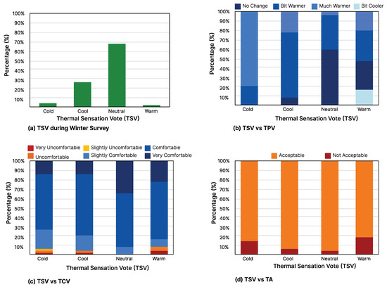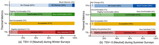 TPV (Thermal Preference Vote) corresponds to how the occupant would prefer to adjust their thermal environment and is a better measure of what an ideal environment would be as it suggests a change from the current conditions. Therefore, TPV is often used as an effective measure to help in the prediction of HVAC systems and optimize energy efficiency [21]. Furthermore, it is also considered to be the most interpretable indicator among the other thermal comfort metrics [22]. TA (Thermal acceptability) determines whether the occupant accepts the current thermal conditions or not. Although “acceptability” is ideal, it is not equated with “comfort” since an occupant may not feel comfortable yet still accept the environment [23]. Thermal Satisfaction Level (TSL) describes the occupant satisfaction with the temperature and is measured by a seven-point Likert scale, based on the ASHRAE PMV survey, ranging from −3 to +3 (Very Dissatisfied to Very Satisfied).
