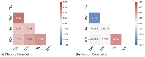 Two different techniques, namely the Pearson correlation and distance correlation method, were used to study the nature of the relationship between metrics. Distance correlation is a measure of dependence between two paired random vectors of arbitrary, not necessarily equal, dimension. Distance correlation is zero if and only if the two vectors are independent. Therefore, distance correlation measures both linear and nonlinear associations between the two vectors. In contrast, the Pearson correlation only measures the linear relationship associated with two vectors.