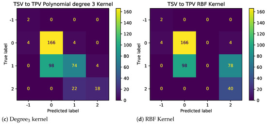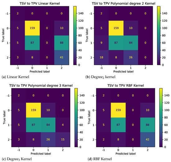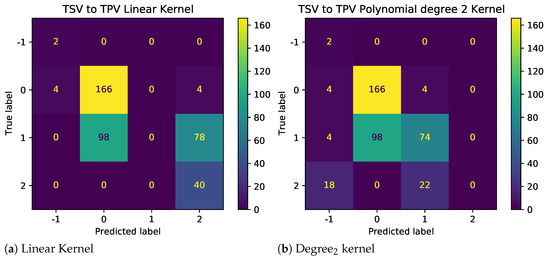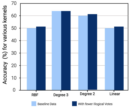 The results as shown in Figure 7 demonstrate the impact of illogical votes on the ability of different kernels to predict TPV from TSV. Two observations stand out. First, the performance of nonlinear kernels (2nd and 3rd degree) is significantly higher than those linear and radial bias unction (RBF) kernels. Thus, polynomial kernels are more suited for models used to predict other metrics using given TC metrics. Second, looking at the confusion matrices in Figure 8 and Figure 9, for baseline and sanitized data, respectively, there seems to be a clear impact of illogical votes on the classifier’s performance. However, it can be seen in Figure 7 that the accuracy of nonlinear kernels does not seem to be severely impacted.