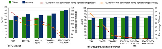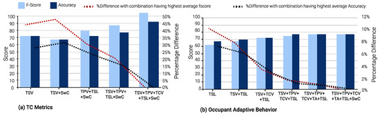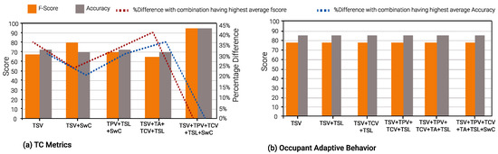A unique observation concerning Occupant Behavior prediction models in winter is that the average F-score and accuracy across all input combinations is approximately 77% and 84%, respectively. The difference, when compared to the best-performing input combination, is less than 1%. Furthermore, when adaptive behavior model performance for summer and winter seasons is analyzed together, the percentage difference, compared to the best-performing input combination, is ≈11%. However, for models that predict other TC metrics, the percentage difference can go up to 40% for F-score, vis-a-vis the best-performing input combination.