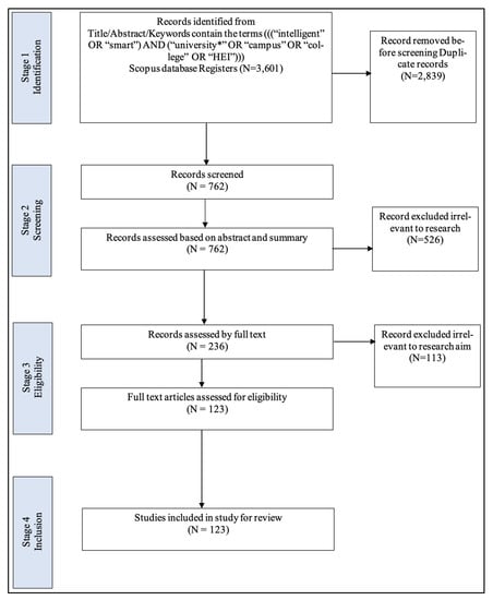 The first phase of identification in planning involved developing the research aim, research question, a list of keywords, and the criteria for the inclusion and exclusion of articles. The aim of the research was framed to generate insights into the application of the four domains in making smart campuses. The criteria for inclusion included peer-reviewed journal articles in English, available online, relevant to the research aim. The search was conducted using the query string of (((“smart” OR “intelligent”) AND (“campus” OR “universit*” OR “college” OR “higher education institution” OR “HEI”))) to search the titles and abstracts of available articles. The first stage of the search gathered 3601 journal articles. Further exclusions were applied on relevant subject areas, peer-review status, and online full-text availability, resulting in the selection of 762 articles.