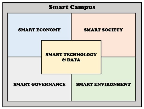 Providing the review results in a structured way requires categorizing the literature on smart campus under widely accepted domains. For that purpose, the study adopted the four domains of economy, society, environment, and governance, with an overarching (digital) technology and (big) data perspective. These domains (illustrated in Figure 2) are widely used in urban research [], and align with common understandings of sustainable development at the microlevel for an inclusive framework [], which is generally a key rationale for the “smart” concept [,].