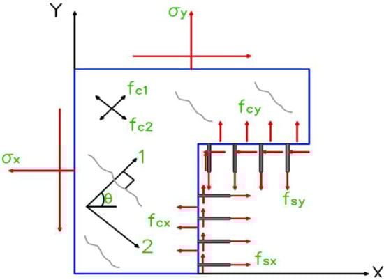 where and are the applied stress in the x and y directions, respectively; and are the average concrete stress parallel to the x and y directions, respectively; and represent the reinforcement stresses in the x and y directions, respectively; and and are the reinforcement ratios in the x and y directions, respectively.