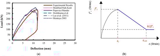 The ascending branch of the concrete stress–strain response (compression pre-peak) is modeled using the Hognestad (Parabola) model. This model is adopted according to the comparison between numerical predictions and experimental results for various pre-peak models available in the software, as shown in Figure 3a. Hognestad (Parabola) model is preferred because it provided better numerical predictions in terms of peak load compared to the experimental results. The Hognestad (Parabola) model is characterized by linear behavior until reaching approximately 70% of the concrete compressive strength. Afterward, the stress–strain relationship converts to non-linear behavior up to failure [,,], as depicted in Figure 3b.