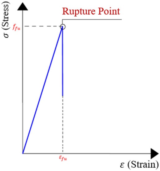 The behavior of the FRP materials is taken as a linear elastic material, where it usually behaves elastically linear until the rupture point with the absence of any yielding stage [,,,,,,], as shown in Figure 7.
