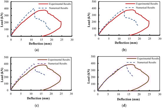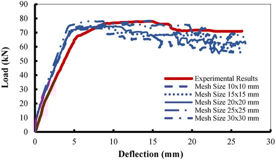 To study the effect of the meshing size on the accuracy of the developed FE models, different mesh sizes are attempted to specify the sufficient mesh size. It should be mentioned that a mesh sensitivity analysis is carried out for each control specimen to specify the appropriate mesh size. For instance, a square mesh size of 25 25 mm for Murthy et al. [] showed load–deflection behavior similar to the experimental one, as illustrated in Figure 8. Furthermore, the maximum loading capacity of this mesh size is comparable to the experimental one.