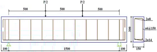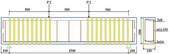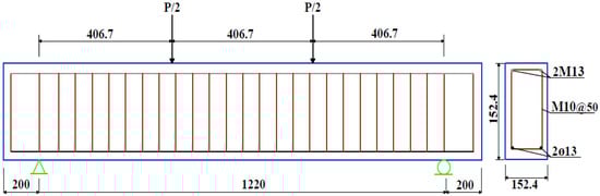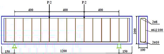 The first set of numerically simulated specimens was experimentally tested by Murthy et al. []. The control specimen of this study labeled as “CBA” had 35 MPa concrete compressive strength and rectangular cross-section (200 100 mm), as illustrated in Figure 9. The beam was tested under four-point bending spanned over 1200 mm. For the longitudinal reinforcement, two bars of 10 mm and another two of 8 mm were placed at the bottom and top of the beams, respectively.
