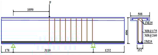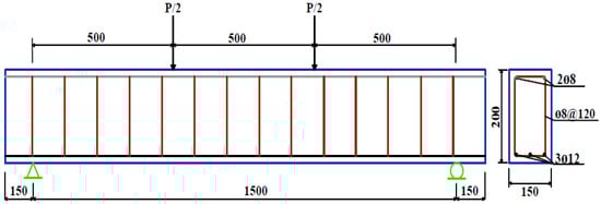 Another set of experimental programs that were tested under four-point bending by Banjara and Ramanjaneyulu [] is investigated in this study. The control beam designated as “C” is modeled. The concrete compressive strength of the specimen was 35 MPa, and it was made of a rectangular cross-section (200 150 mm), as shown in Figure 10. The flexural reinforcement of the specimen is composed of three steel bars of 12 mm in the beam’s tension zone and two 8 mm bars in the compression zone. Transverse steel of 8 mm was spaced at intervals of 120 mm.