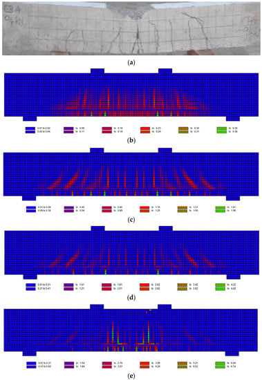 Crack Width (mm) and Failure Mode of Specimen (CBA): (a) Experimental failure mode []; (b) Cracking at 26% of the Ultimate Load; (c) Cracking at 65% of the Ultimate Load; (d) Cracking at 90% of the Ultimate Load; (e) Cracking at 100% of the Ultimate Load.