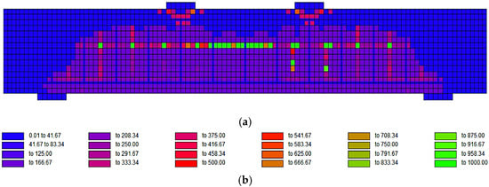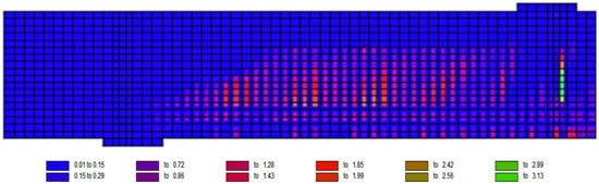 To fully account for the damage mechanism when FRP composites are considered, the failure modes have to be announced, discussed, and investigated. In this regard, the S3-EB specimen [] failed due to the crushing of the concrete mode of failure, which is identical to the numerical failure mode. Figure 23 shows the crack pattern as obtained numerically.