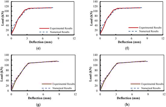 The current numerical study involves the modification of some of the specimens previously modeled to accommodate the addition of FRP composites for shear-strengthening. The predictions of the finite element model are compared to the test results to validate the model’s accuracy. The FRP composites are simulated using two modeling approaches: smeared layer element and discrete truss element. Figure 22a–f illustrate the experimental and numerical load–deflection curves of the FRP shear-strengthened specimens.