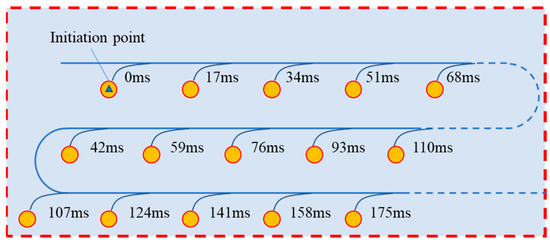 The coal mine uses ammonium nitrate/fuel oil (ANFO) as explosive with a charging weight of 200 kg in each hole. The initiation charge package is 2 kg 2# rock emulsion explosive. The blast hole diameter is 170 mm; the bench height is 16 m, and the hole depth is 18 m. The spacing between adjacent holes is 7 m, whereas the row spacing is 5 m. The intra-row delay time is set as 17 ms, and the inter-row delay time is set as 42 ms and 65 ms. The industrial electronic detonator adopted by the detonator has a high accuracy compared with the blasting detonator, and it is not easy to cause vibration superposition due to the deviation of the detonation time. The schematic diagram of the initiation network is shown in Figure 5.