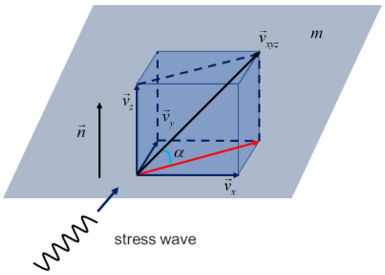 The stress wave generated by the explosion spreads to the surface through rock mass, causing surface vibration. The cube in Figure 9 represents the vibration sensor, and the m plane represents the surface plane where the measurement point is located. The disturbance of the stress wave can be recorded using a vibration sensor. The recorded data are the particle velocity vectors of the particle in three directions at each time. Assuming that the particle velocity vectors corresponding to the extreme value of the signal in any direction are , , and , the sum of the three vectors is the resultant velocity vector .