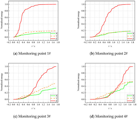 By observing the 4 figures, it can be concluded that the final accumulated energy in the Z direction is the largest, which is 2–5 times the final accumulated kinetic energy in the X and Y directions. The period during which the energy differential between the horizontal (X and Y directions) and the vertical (Z direction) increases differs with the expansion of the energy curve. As the distance between the measurement points 1#~4# and the explosion point gradually increases, the time is gradually delayed. The growth rate slows down before the end of blasting, but the energy is still higher than in the X and Y directions. The cumulative energy growth curve validates the consistency between the increasing peak amplitude process and the energy variation. The occurrence of increasing peak amplitude is accidental, while the energy variation is continuous. The variation of increasing peak amplitude is not a random event. The significant increase in the cumulative energy growth rate in the Z direction compared to the XY direction corresponds to the moments when the distance is closer. The law of increasing peak amplitude variation corresponds to this phenomenon, indicating that the vibration velocity of the particle is mainly dominated by the Z direction when the distance is closer.