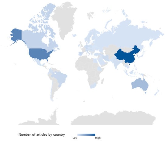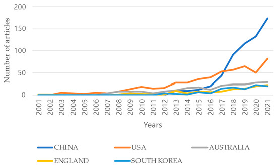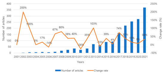 Figure 3 shows the trend for annual publications between 2001 and 2021 in this field. Excluding the initial years from 2001 to 2003, the growth rates for publications in this field in 2008, 2013, and 2017 were high at 80%, 103%, and 74%, respectively. These data suggest that potential external interventions, such as government policies or the emergence of new technologies, affected the number of publications. Furthermore, the data show that the number of publications continued to increase after 2016. The growth rate for publications in the field began to slow after 2017; however, the overall trend remained positive. Furthermore, the growth in publications in this field drastically increased between 2020 and 2021, indicating that research efforts in this field have not diminished and can be expected to intensify in the future, partly due to growing environmental concerns.
