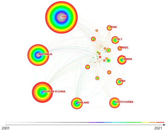Figure 5 demonstrates the collaborative links between countries through a chronogram generated in CiteSpace software. The overall size of the wheel reflects the number of citations, while the wheel color corresponds to the year and the wheel thickness indicates the number of articles published within the corresponding timeframe. A total of 67 countries were involved in research in this field, with approximately 297 lines showing the cooperation between countries and a density score of 0.1343, which refers to the average level of cooperation for urban runoff management. The data show that a longer study period corresponded to a higher number of publications and connections with other countries, indicating a higher degree of cooperation. Conversely, countries with fewer publications tended to have lower levels of cooperation with other countries.