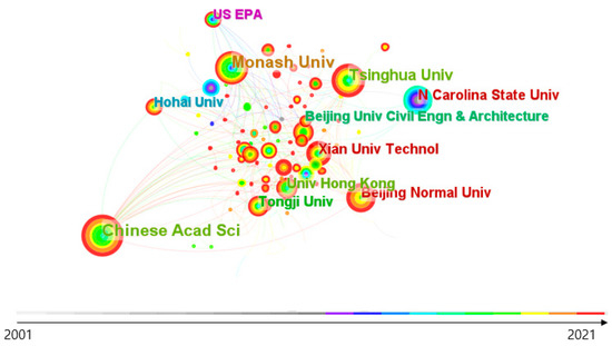 A network mapping analysis of institutional cooperation identified research institutions at the forefront of research in urban runoff management. There were 236 institutions involved in this area of research (Figure 7) with 372 links and an overall cooperation density of 0.0134, making the density at the institutional level lower than that of international cooperation. Universities accounted for 83.3% of the institutions in the top ten. For example, Monash University in Australia ranked first in terms of the number of articles published and was the first institution to invest in this scientific field in 2007. The institution’s top two most cited articles are by Roy, A. (2008) and Coutts, A. (2012), which have 373 and 215 citations, respectively. The study by Roy, A. (2008) summarized seven key barriers to stormwater management, drawing on lessons learned from traditional green infrastructure failures in Australia and the USA, with the aim of slowing the ecological degradation of rivers and proposed solutions to improve river ecology by promoting urban stormwater management [21]. Furthermore, Coutts, A. (2012) proposed to combine water-sensitive and climate-sensitive urban designs to harvest and retain rainwater in the context of an urban landscape in order to reduce urban temperatures and improve human comfort [22]. Table 1 shows the top 20 research institutions with the most publications in the field. China accounted for 55.5% of these institutions; however, it recently entered the field in 2014. The top two most cited articles from Chinese research institutions are by Xia, J. (2017) and Sang, Y. (2016), with 185 and 42 citations, respectively. Xia, J. (2017) studied the urban water issues plaguing China and concluded that the construction of sponge cities in China is confined to low-impact development, demonstrating relatively weak integration with other disciplines, such as urban hydrology and ecological landscaping, and thus requiring improvement [23]. Furthermore, Sang, Y. (2016) also focused on urban flooding and argued that current runoff management approaches have not met expectations. Therefore, urban flooding and its associated problems have not been resolved and require both structural and non-structural measures to improve sponge city construction [24]. It is clear that institutions prefer to focus on problems within their own countries, and Chinese institutions began researching these technologies later than other countries. Articles from China are mainly based around major questions and constructive comments. Australian institutions were the first to begin research in this field and are in a better position to suggest concrete solutions and direct future studies. On the whole, these data suggest that countries have a clear understanding of their research landscapes, as well as the areas they need to develop in the future.