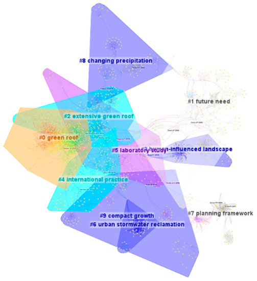 The clustering of co-cited studies reflects the extent of knowledge in a field, which is fundamental to a field’s development and overall level of theoretical support, as shown in Figure 8. The “green roof” categories (#0 “green roof” and #2 “extensive green roof”) are technical and are included in every runoff management approach. Green roofs include different national and climate characteristics and can have positive effects with regard to runoff, rainwater harvesting, and rainwater quality filtration [25,26,27,28]. Category #4, “international practice”, refers to the comparison and evaluation of different international standards and technologies for stormwater management. In this work, researchers showed a positive tendency towards proposing new stormwater management practices and suggested more effective solutions and improvements by studying and comparing relevant technologies and management frameworks [29,30,31]. In the two categories “urban stormwater reclamation” (#6) and “compact growth” (#9), the role of drainage facilities with regard to urban stormwater management is mentioned extensively because sustainable drainage has the potential to improve urban water management and can reduce problems involving road surface runoff and pollutant loads through bioretention facilities and permeable pavement materials [32,33,34].