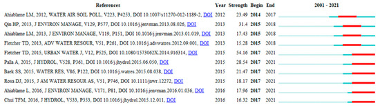 Citation bursts are sudden increases in citations that occur over a short period of time; they are analyzed to check the range of and trends in the research impacted by the cited studies within a given cycle, as well as to identify influential topics in terms of burst intensity and duration. For this study, burst intensity was analyzed for the top ten publications, with a total of 60 burst items ranked according to intensity, as shown in Figure 9. The color red indicates the burst time period and the color blue indicates the unaffected period. For each stormwater management research area, both emergence intensity and duration were analyzed.