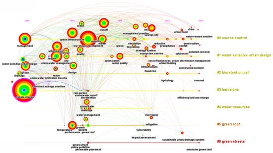 A total of eight clusters were generated and the first five were selected (Figure 14). In these clusters, which span the period from 2004 to 2021, stormwater runoff management concepts have the longest history of study in terms of ecosystem vitality. All studies included have continued to the present day and are closely interlinked. Group #2, the “SWMM model”, was the cluster with the longest history of studies being published. The Storm Water Management Model (SWMM) is a software application developed by the University of Florida, USA, which has been widely applied in the analysis of the impact of rainfall on urban runoff. It is helpful in planning how urban drainage systems can be optimized in order to reduce economic losses, such as those caused by urban flooding [77]. This software allows for the effective analysis and assessment of the impact of stormwater runoff management on urban runoff control [78]. More simulation models are currently being applied to rainwater runoff management, including the simulation of pollutants and permeability. However, due to the limitations of pollutants and the lack of concentration data regarding the process of pollutant diffusion, it is impossible to verify the simulation data results. Thus, more systematic data collection and the unification of relevant numerical models could be helpful in improving diffusion and anti-diffusion process related to pollutants [79].