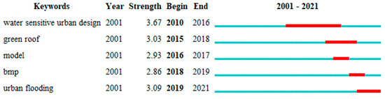In total, there were 12 emergent items. The top five were selected, and the top two to three words in terms of intensity were analyzed. As shown in Figure 11, “water sensitive urban design” (WSUD) was not only the most frequent term but also the longest lasting emergent item. This is attributable to the number of measures, many of which are multifunctional, that WSUD offers. These facilities are not only better able to cope with the negative effects of climate change but can also help to address the urban heat island effect and improve the microclimate [51,52,53].