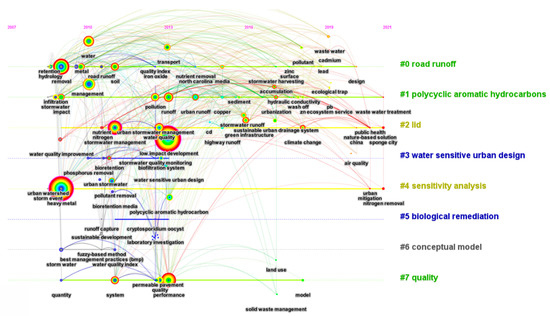 Eight clusters were extracted (Figure 12) spanning the period from 2007 to 2021. The field of environmental health has existed longer than the field of climate research. Cluster #1, “polycyclic aromatic hydrocarbons”, was most closely associated with clusters #2, “LID”, and #4, “sensitivity analysis”, and it showed a longer research history.