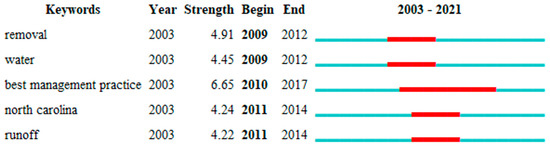 There were nine emergent terms in total, and the top five were selected (Figure 15). No new terms have emerged recently, and, therefore, there were no new research trends in the field. The term “best management practice” (BMP) had the longest time span and the greatest strength, and it covered two aspects: industrial wastewater control and municipal wastewater control. Low-impact-development stormwater management measures are referred to as subsets of BMPs and BMP facilities [82]. The combination of LIP and BMP measures can effectively address the complexities of the urban hydrological environment and social factors [83] and provide a more diverse range of ecosystem services.