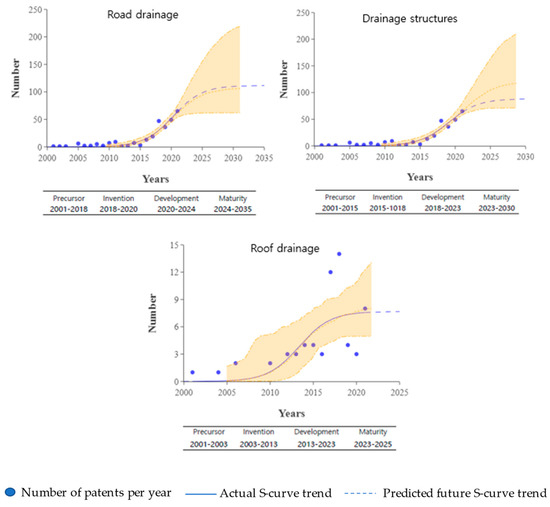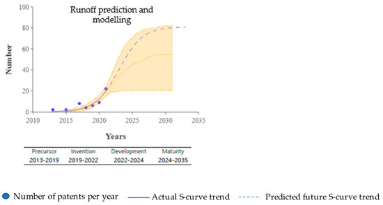 A graph known as the s-curve was mainly used for the analysis of patent data. The s-curve is often adopted to describe future prospects and trends in both economies and technologies [19]. In general, technological growth occurs in a cyclical pattern, and the relationship between slow and quick stages of technological development is generally captured by an s-curve. Furthermore, the life cycles of technologies and products can be divided into four phases: the exploration phase (introduction), the growth phase, the maturity phase, and the stagnation phase (saturation) [20]. In this study, a patent trend analysis was performed in Loglet Lab 4 as a means of analyzing and predicting the range of technological developments related to stormwater runoff.