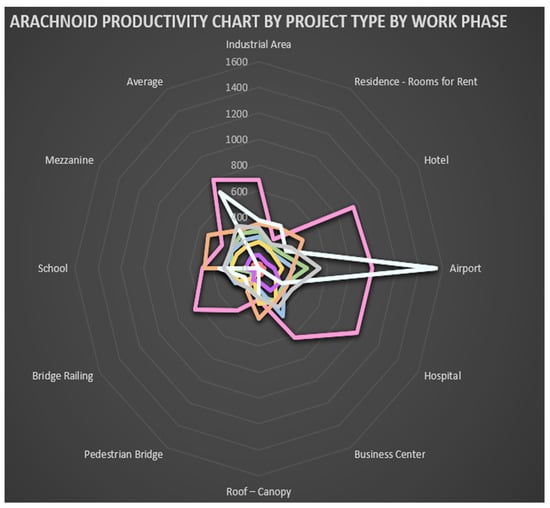 The construction industry, including its productivity, is one of the most significant sectors that supports the economic development of a country. Specifically, the construction sector is the engine of growth for a country since it creates a flow of services and goods with other sectors [,]. Therefore, every attempt to provide consolidated indexes of productivity is very important since it can help public organizations and companies to accurately estimate time and cost, and to search for methods for the improvement of these metrics. This research attempted to fill the gap in the literature and provide, for the first time, specific indexes of productivity for steel structures of ten different types of projects, with eight phases of construction for each type, and the organization risks related to these projects.