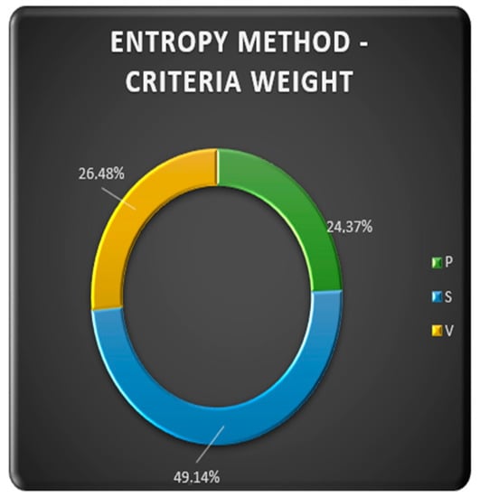 Further to the analysis, to implement the TOPSIS method, three parameters were used. These were probability (P), severity (S), and vulnerability (V). Vulnerability is described as the intrinsic properties of a system that make it susceptible to a risk source that can lead to an event with a consequence [,]. All three parameters are expressed on a scale from 1 to 9; for example, 1 stands for “occurrence probability out of risk very low”, whereas 9 stands for “occurrence probability of risk very high” [].