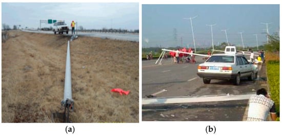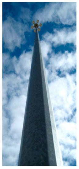 Since the beginning of the 21st century, due to the dramatic increase in traditional energy consumption, strategies to achieve low carbon and new energy development have been established and deployed around the world to overcome energy shortages and dependence on traditional energy []. However, even if the current energy demands have been reasonably assessed and planned for future use, the availability of conventional energy will decline rapidly between 2030 and 2040. For the daily life of human beings in this century, how to use energy reasonably is a critical issue in engineering practice []. For example, street lighting is one of the most energy-intensive utilities, especially in cities and major roads, and consumes more than one-fifth of the world’s electricity annually. With the continued development of society, the proportion of artificial lighting in cities will reach 70% by 2050. Therefore, the modernization and performance improvement of public lighting is becoming an essential lever for sustainable development []. For city lighting, high-pole lighting is generally a high-rise structure with a height of 20 m or more. Because of its wide illumination range and vital function, it has been widely used in large stadiums, airports, overpasses and other places in recent years []. From a structural point of view, tall lamp poles are characterized by their height, small cross-sectional area and remarkable wind vibration effect. Working in high-altitude outdoor environments for extended periods makes them particularly vulnerable to the effects of natural wind induced vibration. At present, it has been confirmed that the fluid–structure interaction is an important reason for the wind-induced vibration of the high-mast light pole as a highly flexible structure under the excitation of natural wind. During the normal operation of high-mast light poles, there is a potential physical phenomenon called vortex-induced vibration. Vortex-induced vibration occurs when the fluid flows through the bluff body, and the formation and periodic shedding of the vortex will cause the vibration of the bluff body []. Once the vibration intensity reaches a certain level, the flow field shedding will be locked, which results in large vibration energy and directly causes fatigue damage and resonance damage to the structure [,,]. In practical engineering, wind-induced vibration frequently damages tall pole lights and causes significant adverse effects. On 14 February 2003, a light pole in western Illinois collapsed due to wind-induced vibration [], as shown in Figure 1a. On 12 November 2003, on the I-29 highway in Iowa, several tall pole lights collapsed due to wind-induced vibration on the open ground beside the interstate highway []. In China, similar accidents have also occurred occasionally. For example, more than 30 lamp poles tilted and collapsed due to wind events on 19 August 2014 in Nanchang City, Jiangxi Province, as shown in Figure 1b. On 26 June 2018, because of long-term wind-induced vibration, one lamp pole near Guanyin Bridge collapsed in Chengdu City, Sichuan Province. On 5 July 2020, one lamp pole collapsed due to wind-induced vibration in Nanning City, Guangxi Province. From the perspective of energy utilization, to extend the service life of high-mast light poles is to save energy. Therefore, it is of particular importance to conduct detailed dynamic analysis and design of high-mast light poles to ensure that light poles can operate safely within their design service periods.