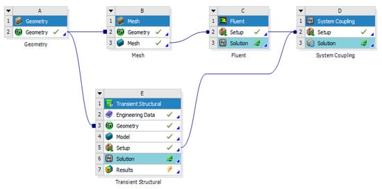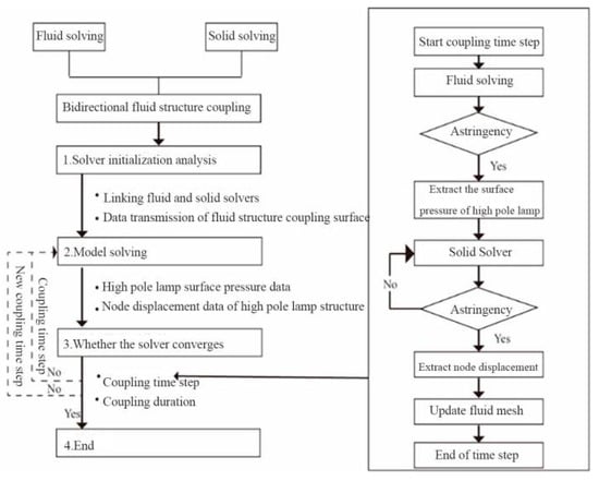 Based on the ANSYS Workbench platform and using the Transient Structural + Fluent + System Coupling module, the numerical simulation method of bidirectional fluid–solid coupling is used to solve and analyze the bidirectional fluid–solid coupling of a high-pole lamp structure. Figure 2 shows the connection between modules using ANSYS software to solve fluid–solid coupling problems. Figure 3 demonstrates a flow chart for calculating the bidirectional fluid–solid coupling problem.