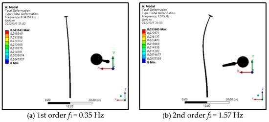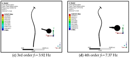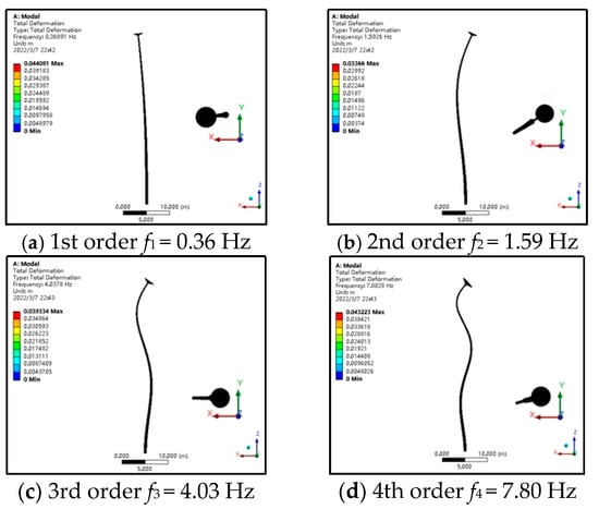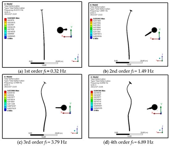 The modal analysis of the lamp pole was carried out, and the first four orders of vibration patterns of the structure were obtained by using the Lanczos method with full restraint on the base of the lamp pole without applying prestress. Figure 9 shows the first four modes of the structure with natural frequencies of 0.36 Hz, 1.59 Hz, 4.03 Hz and 7.80 Hz, respectively. As demonstrated in Figure 9, the lamp pole exhibits translation vibrations in the X and Y directions under the first two vibration modes. The difference is that the first vibration mode is mainly in the X-direction, whereas the second vibration mode is the combination of X-direction and Y-direction translation movements. The third and fourth modes are mainly torsional vibration modes. The third mode is the combination of X-direction translation movement and torsional movement, whereas the fourth mode is the combination of X-direction translation movement, Y-direction translation movement and torsional movement.