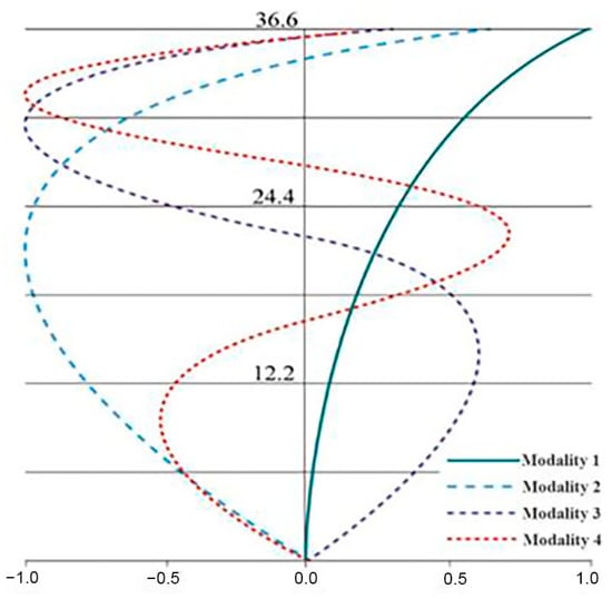 Figure 10 demonstrates the normalized deflections of the first four modes. As shown in Figure 10, the first mode is evident at any position along the length of the pole, whereas the second mode deflects at 23 m, the third mode deflects twice at 14 m and 30 m, and the fourth mode deflects three times.