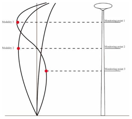 To analyze the dynamic response characteristics of the light pole structure under wind loads, three monitoring points are set on the finite element model to record the stress and displacement responses, as shown in Figure 11. The locations of the monitoring points can be determined by the vibration mode of the light pole structure. According to the results in Section 3.3.1, the maximum deflection of mode 1 is at the top of the pole structure, and the vibration along the length of the pole gradually increases. Meanwhile, the occurrence probability of mode 4, as a higher-order mode, is relatively low. Therefore, the deflections of mode 1 and mode 4 are not adopted as monitoring points in this study. Modal 2 deflects at 23 m from the bottom of the pole, and modal 3 deflects at 14 m and 30 m from the bottom of the pole. Therefore, the positions at 30 m, 23 m and 14 m from the bottom of the pole are taken as monitoring points to analyze the wind-induced vibration dynamic response of the structure.