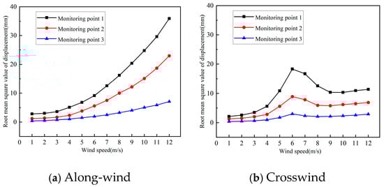 As demonstrated in Figure 12a, the displacements at the monitoring points increase monotonically as the windspeed increases, and there is no significant amplitude change. In addition, when the windspeed gradually increases from 1 m/s to 12 m/s, the growth rate of the root mean square value of the displacements of the structure also increases. The maximum displacements at monitoring points 1, 2 and 3 are 35.9 mm, 23.0 mm, and 7.1 mm, respectively. Figure 12b shows that the displacements at all the monitoring points fluctuate significantly within the windspeed range of 5~8 m/s, which indicates that vortex-induced vibration occurs. In particular, when the windspeed approaches 6 m/s, the root mean square value of the displacement at each monitoring point reaches its maximum value, i.e., 18.3 mm at monitoring point 1, 8.9 mm at monitoring point 2, and 3.0 mm at monitoring point 3.