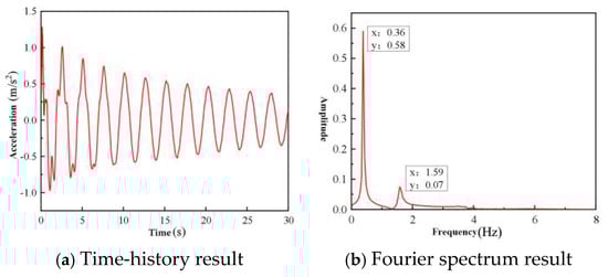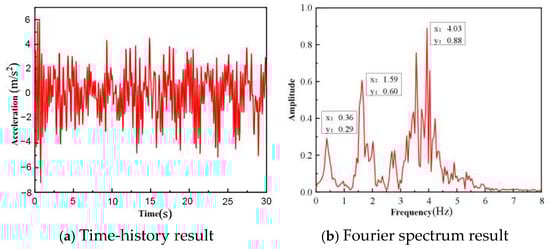 According to the above displacement response results, one can find that significant vortex-induced vibration occurs when the windspeed is 6 m/s, and the largest displacement response is at monitoring point 1. Therefore, the acceleration response at monitoring point 1 is converted from the time–history analysis to the frequency domain analysis using fast Fourier transform (FFT) to reveal more vibration characteristics of the structure under a windspeed of 6 m/s. Figure 13 and Figure 14 demonstrate the time history and spectrum analysis results of the along-wind acceleration response and crosswind acceleration response at monitoring point 1, respectively.