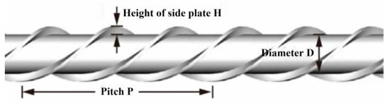 There are many factors that may affect the characteristics of vibration suppression of spiral helical strakes, such as the geometric size, surface roughness, coverage length, drag force performance, flow field characteristics, Reynolds number and surrounding structure, among which the geometric size of spiral helical strakes is the most significant factor. The geometric dimensions of spiral helical strakes mainly include pitch, height and start number. Among them, the pitch refers to the length of the spiral helical strakes rotating 360° around the axial direction of the pole. The height of a strake refers to the size of the strake along the radial direction of the pole. The commonly used start number type of spiral helical strakes includes the three-piece type and four-piece type. Previous research [] has shown that the above two types have no obvious impact on the suppression effect of the structure. Therefore, in this study, a three-piece type is adopted to suppress the vibration of high-mast light poles. The geometric dimension of the spiral side plate is demonstrated in Figure 15.
