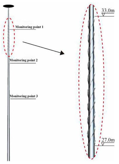 According to the wind-induced vibration responses of the pole, the dominant vibration mode is concentrated in the third mode of the structure. Therefore, the upper end of the spiral side plate is arranged 33 m from the bottom of the pole, and the lower section is set 27 m from the bottom of the pole, covering the critical diameter of the third mode of the high pole lamp, as shown in Figure 16.