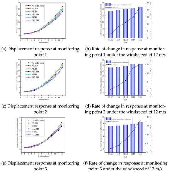 Figure 19 shows that the trends of the along-wind root mean square displacement response of the light pole with different side-plate pitches are basically the same. By and large, spiral side plates may lead to an increase in the along-wind vibration response of the structure. When the incoming windspeed reaches 12 m/s, the root mean square value of the along-wind displacement of the pole without side plates reaches the maximum, with the value of monitoring point 1 being 35.9 mm, the value of monitoring point 2 being 23.0 mm, and the value of monitoring point 3 being 7.1 mm. Under the same windspeed of 12 m/s, the rate of change in responses at different monitoring points has varying degrees of increase.
