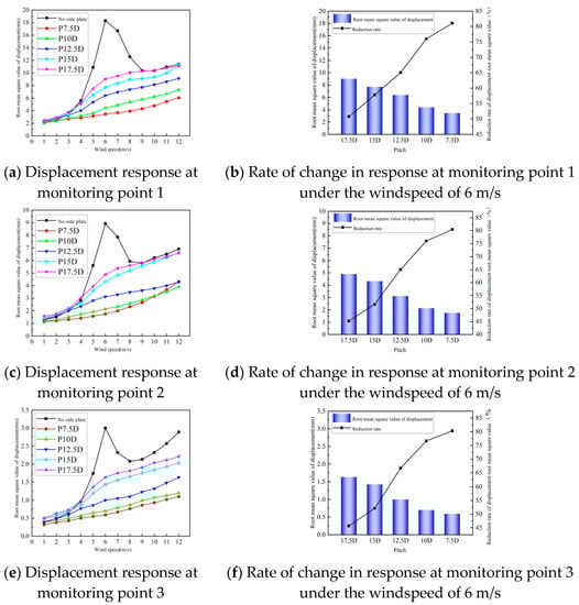 Figure 19 shows the root mean square value of the along-wind displacement response at the monitoring points of the high light pole structure with different spiral helical strake pitches under different wind speeds.
