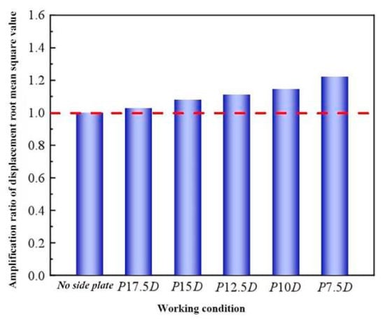 The above analysis results also indicate that when the incoming windspeed reaches 12 m/s, the along-wind displacement of the light pole, whether with or without spiral side plates, reaches its maximum value, especially at monitoring point 1. Figure 21 shows the comparison of the amplification ratio of the along-wind displacement response of the light pole under different pitch conditions when the windspeed is 12 m/s. Here, the amplification ratio is defined as the ratio of the root mean square value of displacement at monitoring point 1 under various pitch conditions to the values of the corresponding light pole without spiral side panels. The red line in Figure 21 represents the baseline for comparing the root mean square value of the along-wind displacement response of the light pole under different pitch conditions.