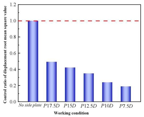 For the crosswind displacement of the light pole without a side plate, when the incoming windspeed reaches 6 m/s, vortex-induced vibration occurs, and the crosswind displacement response of the light pole without a side plate reaches its maximum value, especially at monitoring point 1. However, for the light pole with side plates, the crosswind displacement responses of the light pole gradually increase with increasing windspeed, and there is no obvious vortex-induced vibration. When the windspeed is 6 m/s, the comparison of the control ratio of the crosswind displacement response of the light pole under different pitch conditions is shown in Figure 22. Similarly, the control ratio here is defined as the ratio of the root mean square value of displacement at monitoring point 1 under various pitch conditions to the values of the corresponding light pole without spiral side panels. The red line in Figure 22 represents the baseline for comparing the root mean square value of the crosswind displacement response of the light pole under different pitch conditions.